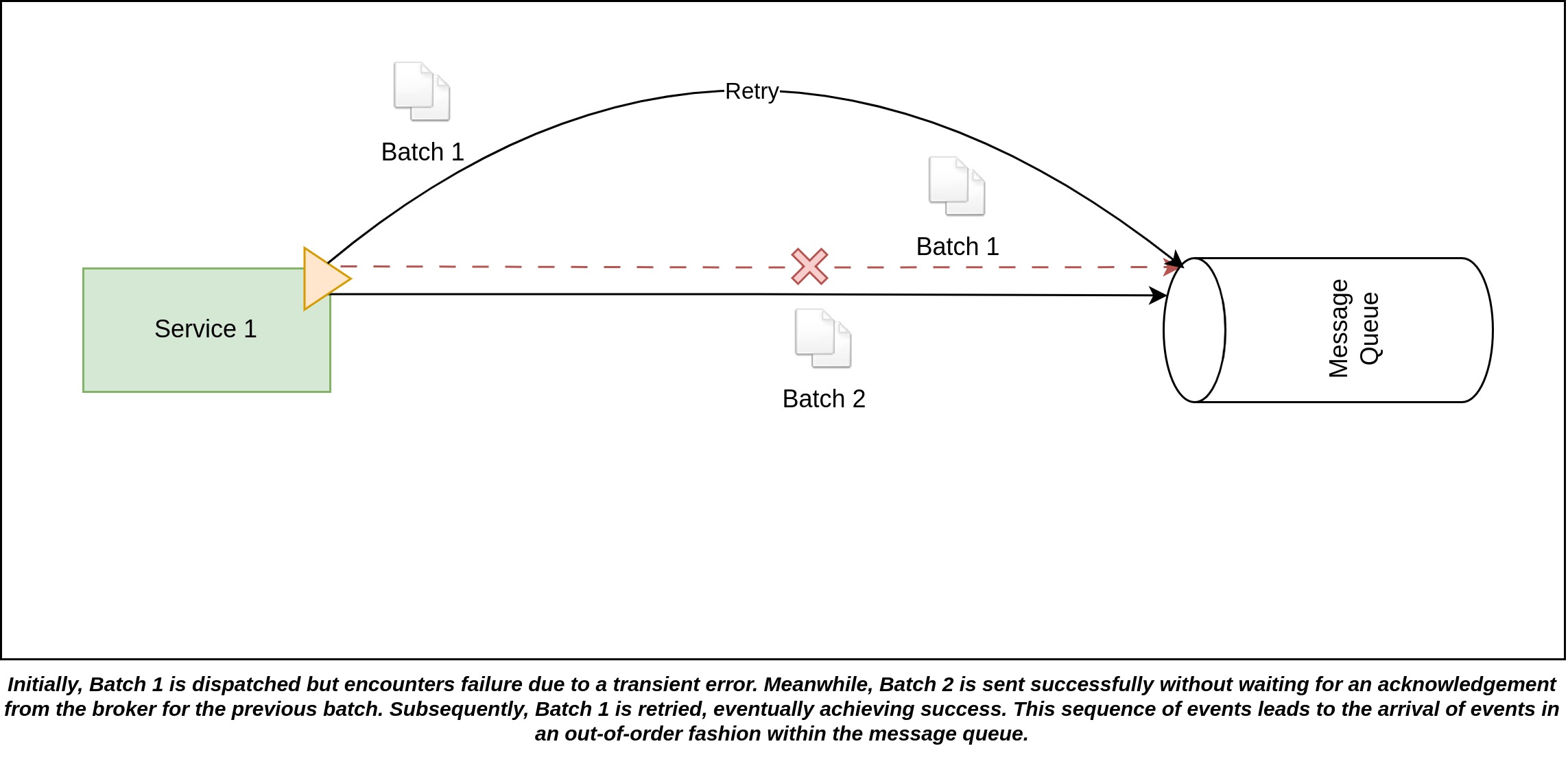 In another potential situation, a batch containing earlier events is sent first but faces a transient error. Meanwhile, a different batch from another producer is sent successfully. Eventually, the first batch is retried and successfully reaches the message queue. As a consequence, events arrive out of order within the message queue.