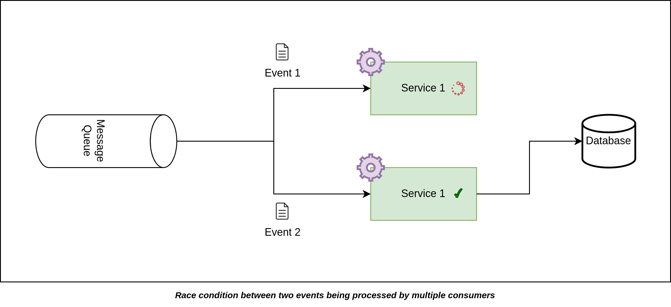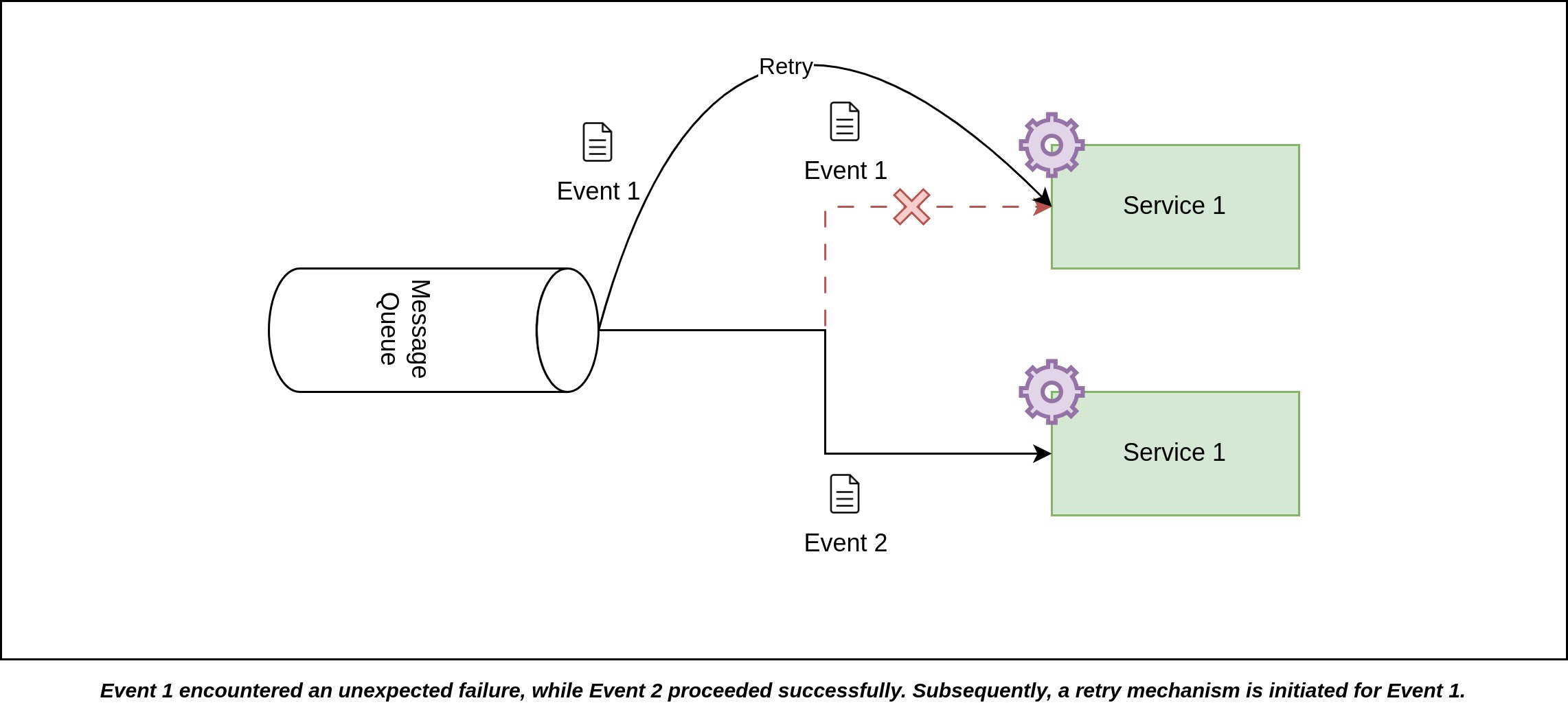 Initially, Event 1 is dispatched to the first instance of Service 1, closely followed by the transmission of Event 2 to the second instance of Service 1. However, Event 1 encounters a failure, resulting in a lack of acknowledgment. Meanwhile, Event 2 is processed successfully, and its acknowledgment is received. With the acknowledgment for Event 1 still pending after a certain amount of time, the message queue initiates a retry to transmit Event 1, which is accomplished successfully this time. Consequently, the order of events becomes disrupted: Event 2 is recorded in the service before Event 1, leading to an out-of-order event sequence.
