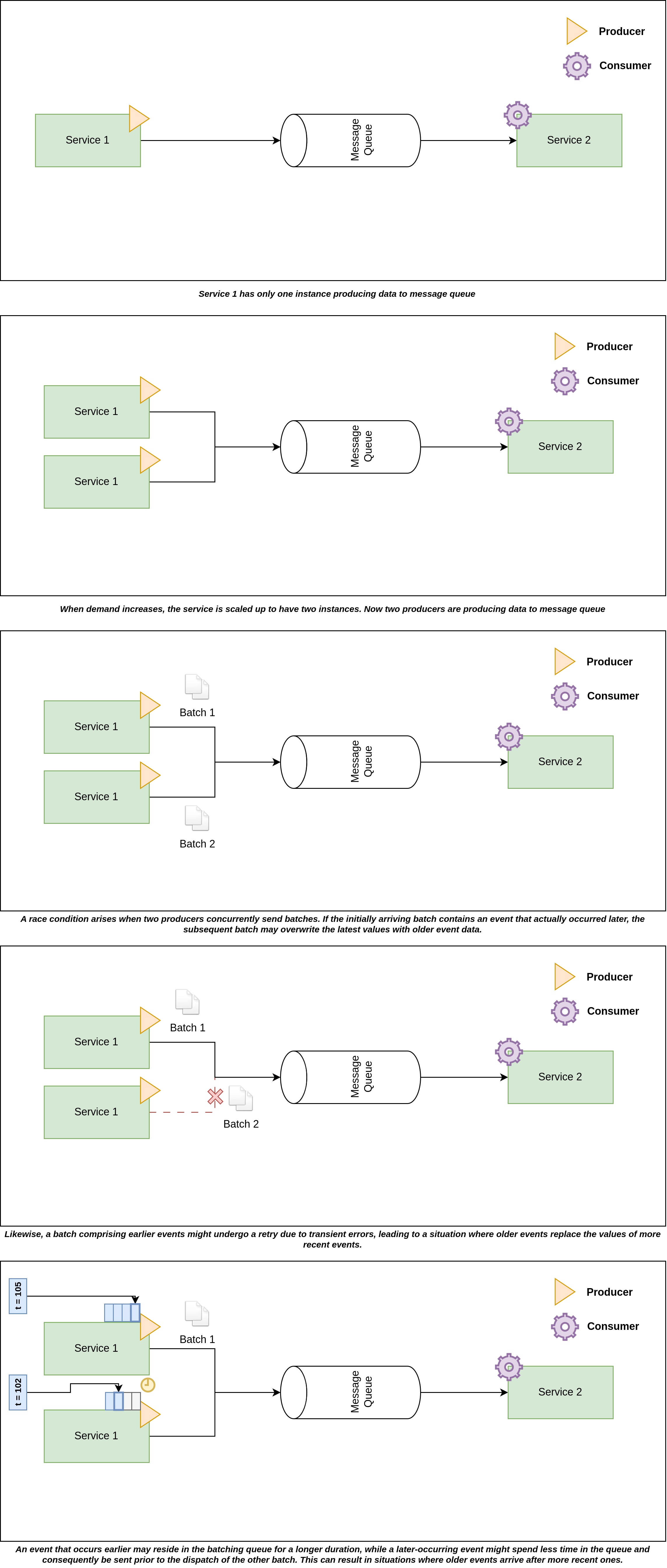 Services are often configured to automatically scale in response to increased loads. When a service undergoes scaling up to have multiple instances, each producer of an instance might simultaneously attempt to send its batch to the message queue, introducing a potential race condition. The initial batch to reach the message queue could include events that occurred later, while subsequent batches might contain events that happened earlier. This dynamic can lead to a situation where older events are positioned after more recent ones, potentially causing a chronological misalignment.
