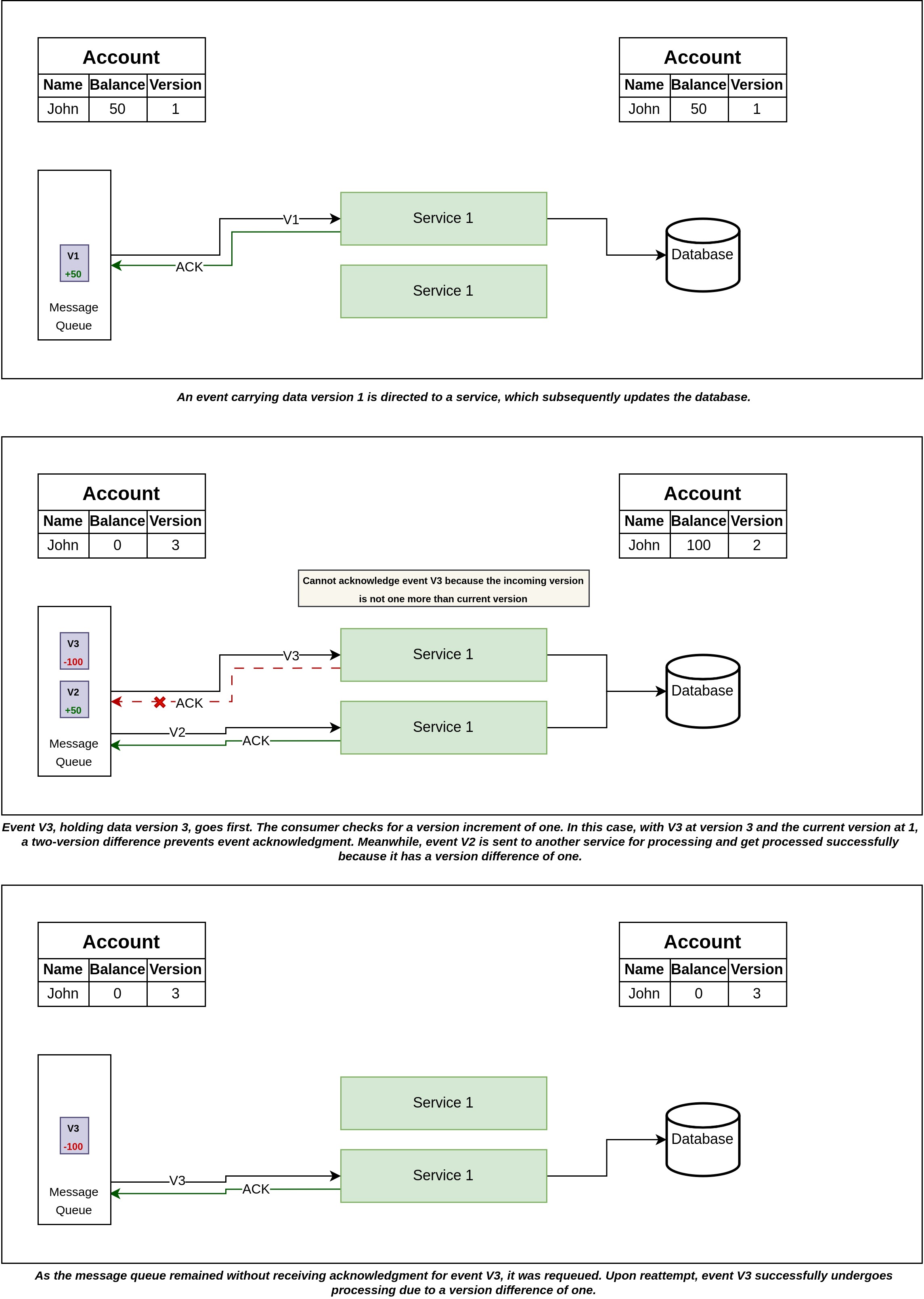 Should we encounter a scenario where a version is missing, it triggers a specific response. In this case, the received version is not acknowledged. The message queue then re-queues the event to be retried after not receiving any acknowledgment from the consumer. Meanwhile the consuming service wait for the missing version to be received, and upon its arrival, it is processed and acknowledgement is sent for it. As a result, not only is the event with the missing version successfully processed, but the initial retried event also goes through the necessary processing steps later, leading to a comprehensive and accurate event processing flow.