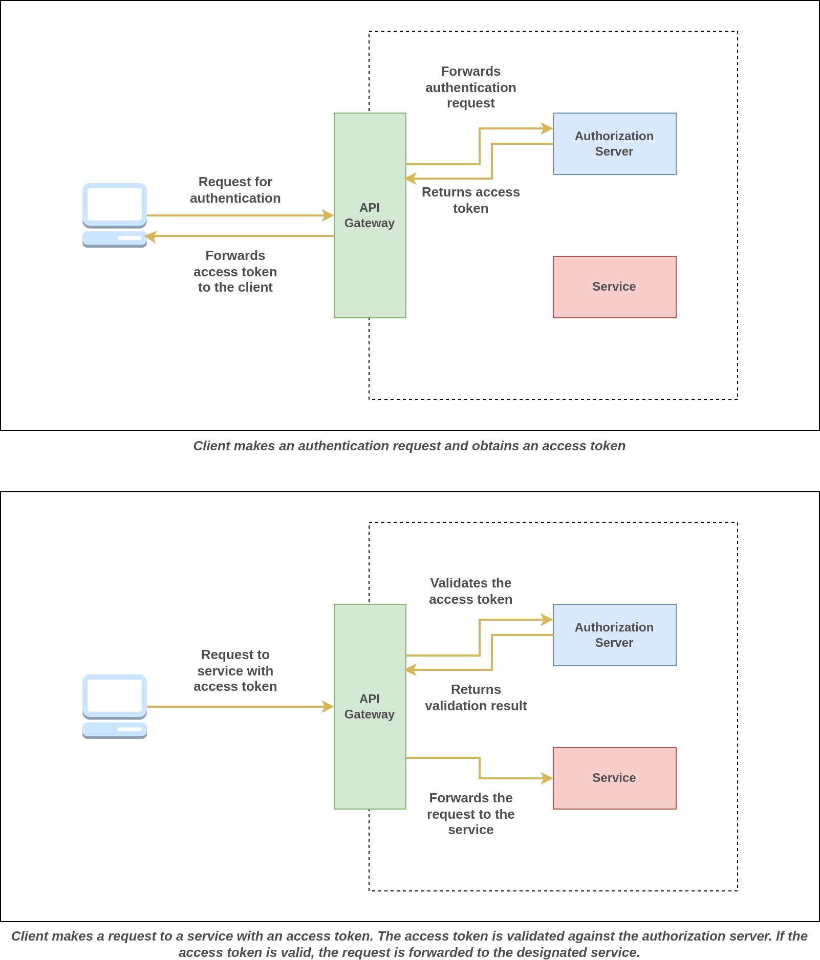 - If additional calls to other services are required to fulfill the request, the same token is passed along to upstream services.