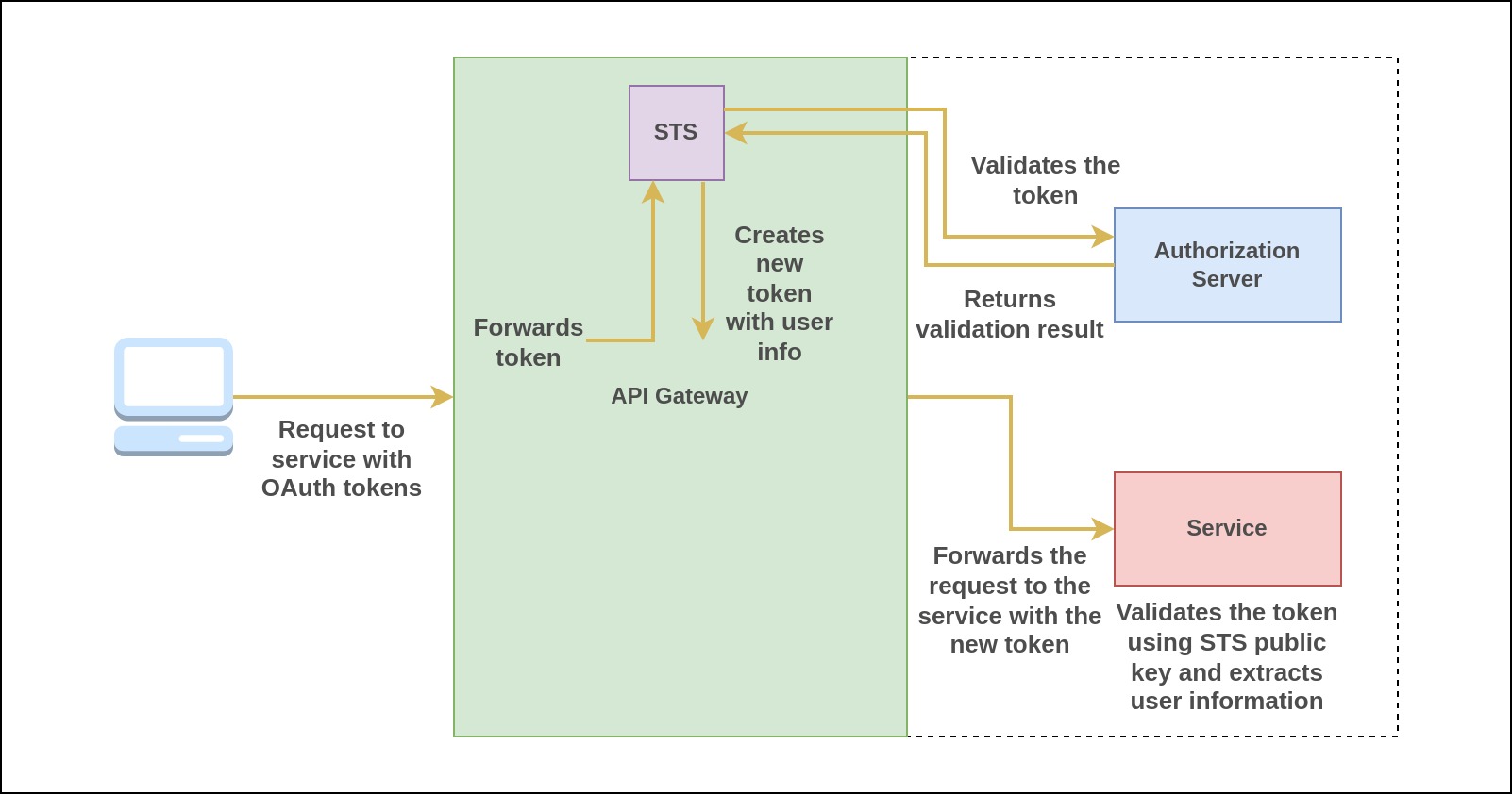 - When the upstream service receives the request, it retrieves the token and validates it using the public key of the STS.