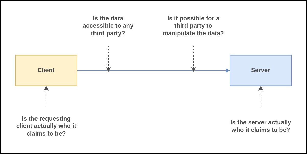 One of the most important security concerns is that the server we are talking to is exactly who we think it is. Malicious actors can impersonate legitimate servers, intercepting sensitive information in the process. This is where technologies like Transport Layer Security (TLS) come into play. TLS helps establish and confirm the identity of the server we are trying to connect with, ensuring that we are communicating with the genuine server and not an imposter.